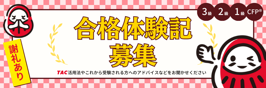 TAC FP(ファイナンシャルプランナー)講座では、見事合格されたTAC受講生の皆さまからの合格体験記を募集しております。TAC活用法やこれから受験される方へのアドバイスなどをお聞かせください!