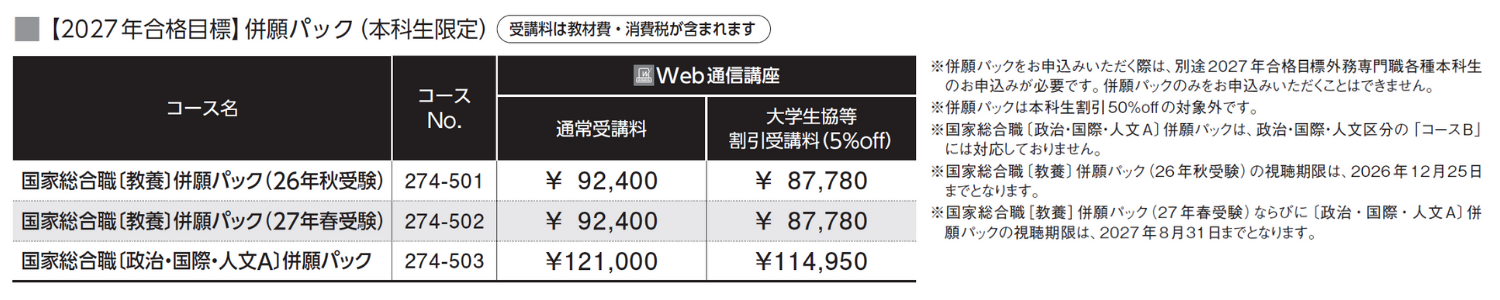 ※国家総合職〈教養区分〉併願パック(27年春受験)の視聴期限は2027年8月31日までとなります。