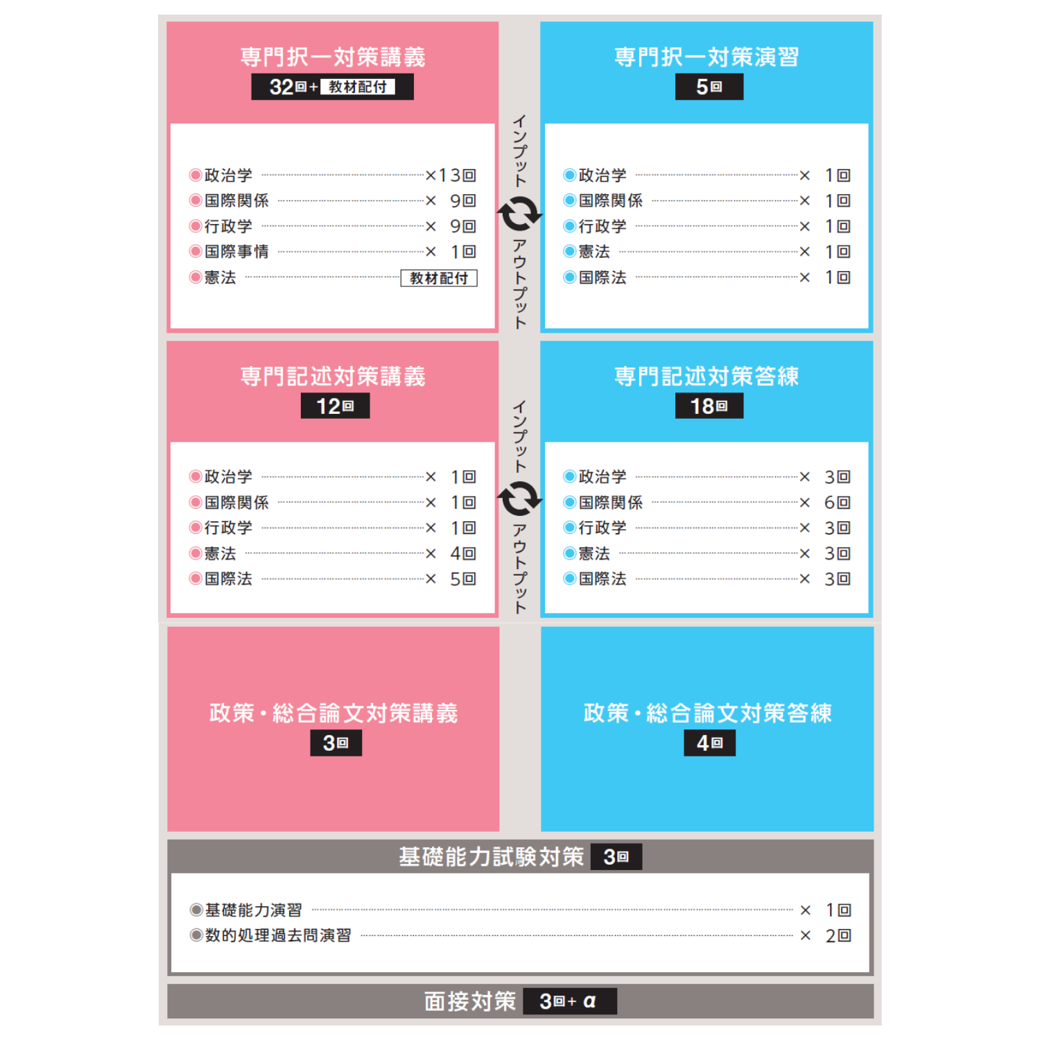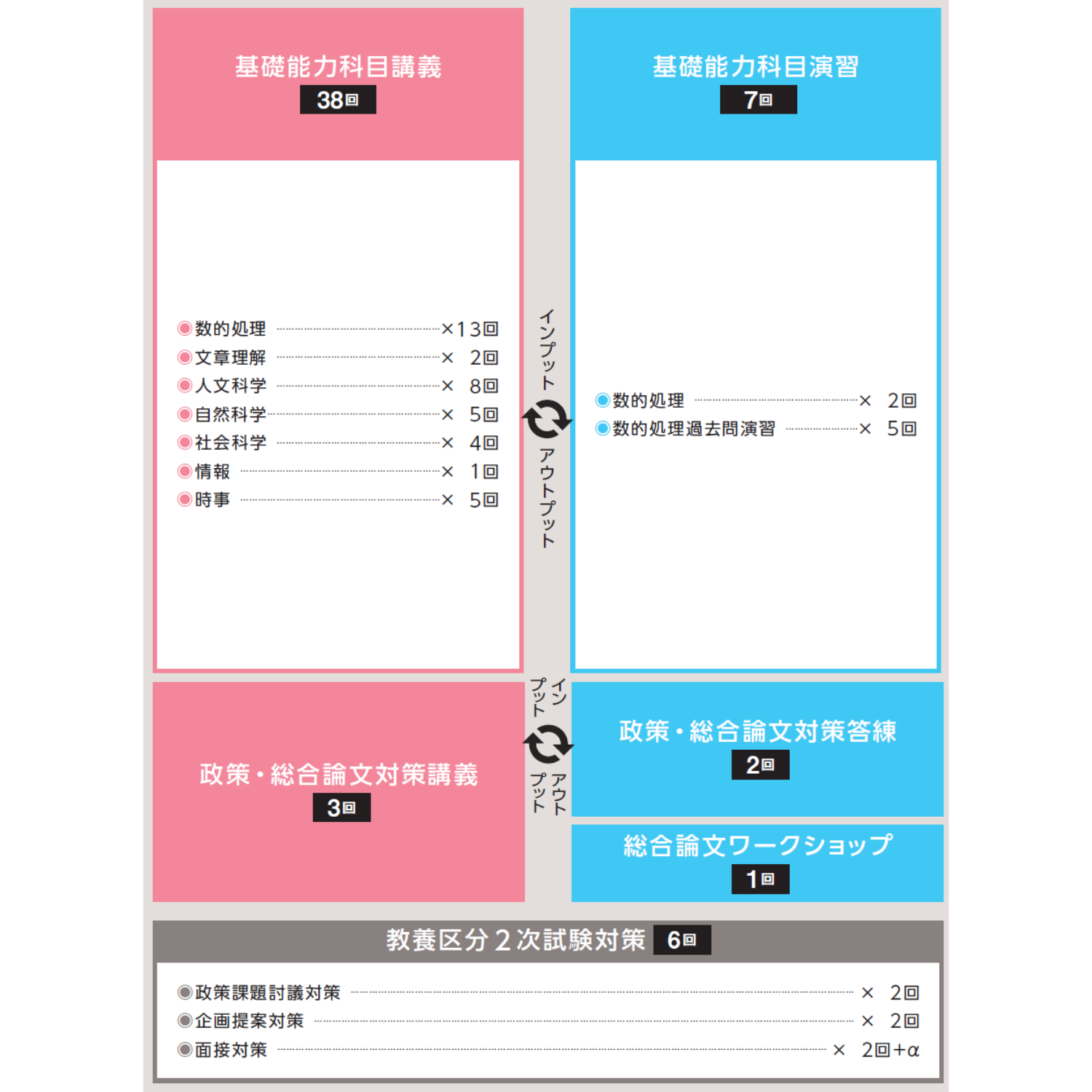 教養区分は専門科目が出題されないため、併願受験のしやすい区分です。外務省専門職にはない「総合論文試験」「企画提案試験(プレゼン)」「政策課題討議試験(グループディスカッション)」が課されますが、併願パックを受講することでこれらの科目にも万全の対策で臨むことができます。