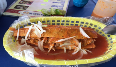 ③グアダラハラで有名な食べ物、パンがチリソースにつけられています