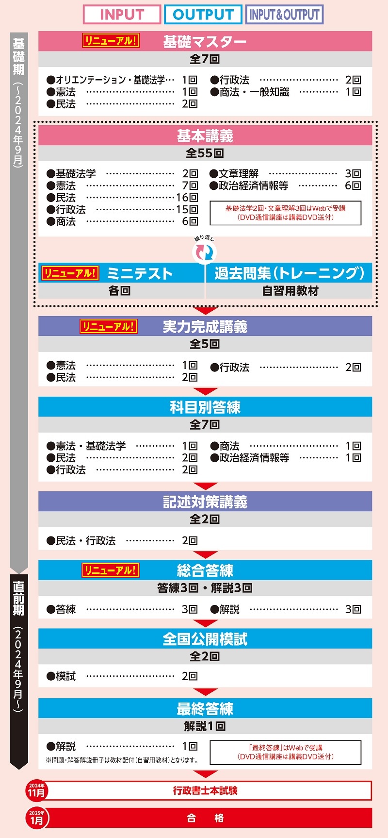 「プレミアム本科生」のカリキュラムに、さらに「基礎マスター」が付いた万全コースです。「基礎マスター」で行政書士試験の全体像と各科目の特徴を学ぶことで、初学者の方もスムーズに学習を進めることができます。【一般教育訓練給付制度 対象コースあり】【全メディアWebフォロー標準装備】