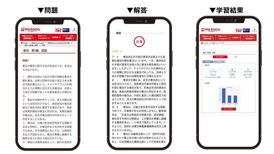 TACでは、本科生の皆さまの学習をサポートするサービスとして「Webトレーニング」をご提供いたします。紙媒体の教材に加え、Web学習ならではの利便性を組み合わせることで、効率的・効果的な学習を加速させます。学習環境の向上に、ぜひお役立てください。