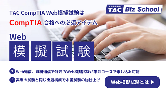 CompTIA認定資格試験に対応したTACオリジナル模擬試験問題を2回分収録(受講期間内に限り何度でも実施可能)。問題は出題順、選択肢が順不同で出題されるため繰り返し学習に最適です。詳細はこちら -