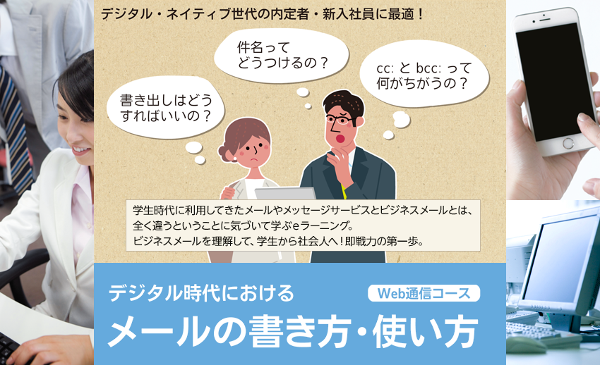 学生時代に利用してきたメールやメッセージサービスとビジネスメールとは、全く違うということに気づいて学ぶeラーニング。ビジネスメールを理解して、学生から社会人へ! 即戦力の第一歩。本コースは、前半でビジネスにおける基本的なメールの使い方を解説、後半で「こんな時はどうしたらいいのだろう?」というケーススタディやその他のコミュニケーションツールとの違いなどを学びます。
