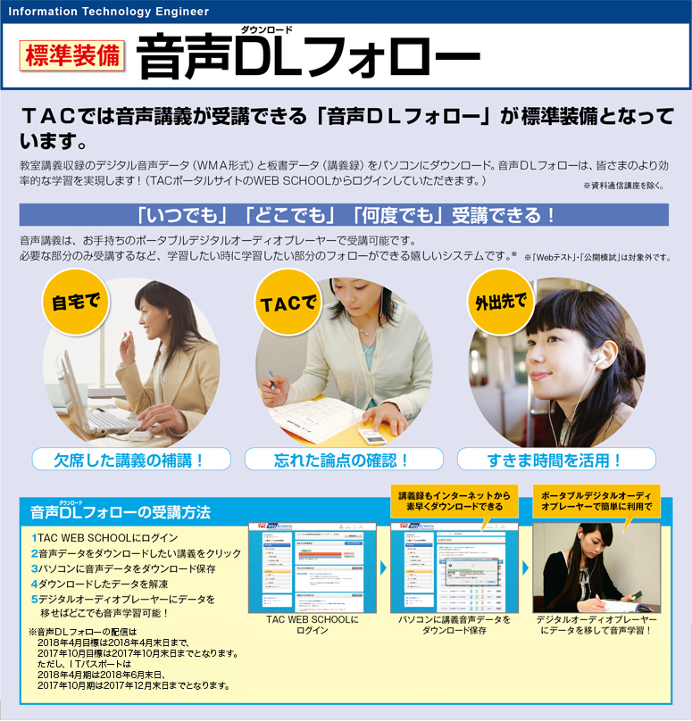 欠席した講義を、TACの各校舎ビデオブースで受講することができます(要予約、有料¥500/1講義(消費税8%込消費税10%込))。