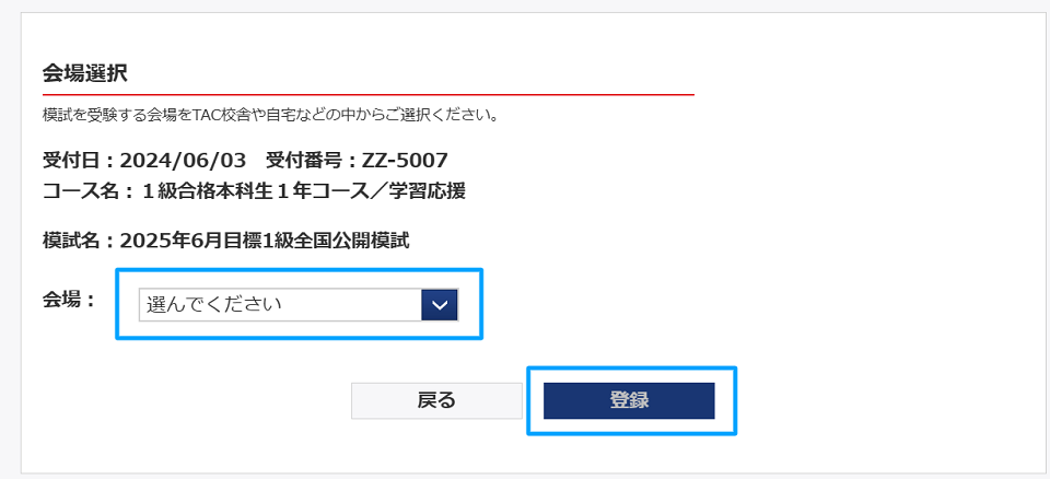 登録を行う模試をご確認→”会場選択”をクリック→受験を希望する会場を選択し”登録”をクリックしてください。