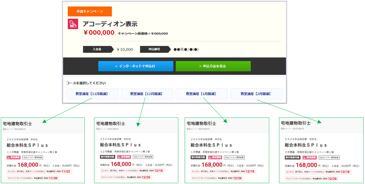 商品ページ内のネット申込ボタンからe受付の複数のページにリンクさせたい場合、下記のテンプレートを使用することができます。