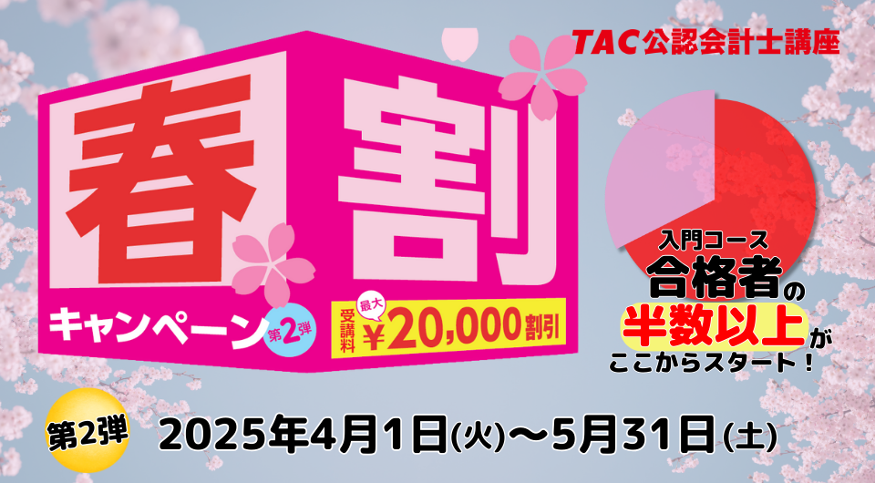 - 春割キャンペーンは、TAC 取扱代理店(大学生協・書店等)割引・NEXT 割引・日商簿記ステップアップ割引・株主優待割引券・法人割引等のいずれか1つとの併用が可能です。