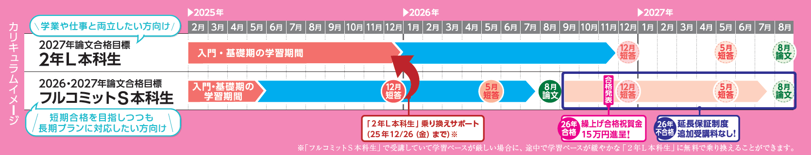 1年目の2026年目標で受講途中で、学習ペースが合わなければ緩やかな2027年目標2年L本科生に無料で変更できます。無理せず目標年を変更して学習を継続できる安心サポートです![2025年12/26(金)まで]