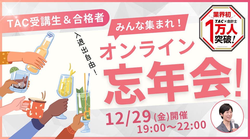 TAC合格者1万人突破を記念し、オンラインで忘年会を開催します!TAC受講生の方はもちろん、過去の合格者の方も参加いただけます。