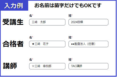 →名…☆印+名前 / 姓…TAC講師