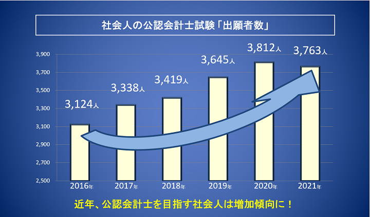 近年は全体的に公認会計士受験生が増えていることもあって、社会人受験生も増加傾向にあるんですよ ♪