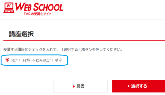 (1)「TAC WEB SCHOOL」にログイン後、25年目標の方は「2025年目標不動産鑑定士講座」、26年目標の方は「2026年目標不動産鑑定士講座」を選択してください。