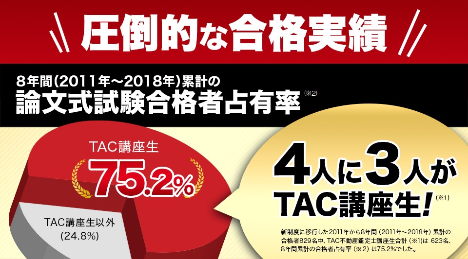※2 合格者占有率は「TAC講座生(※1)合格者数」を「不動産鑑定士論文式試験合格者数」で除して算出し、小数点第2位を切り捨てています。
