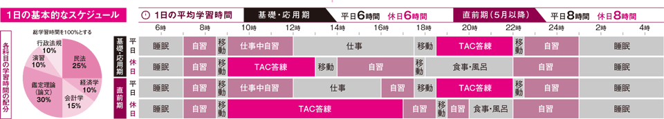 TACの答練カリキュラムに合わせてスケジュールを組んで勉強を進めました。その週に答練のある科目と範囲を重点的にこなし、答練でコンスタントにランク上位に入るように意識して勉強することで自然と上位に入る力が付き、また、ランキングに載ることで答案を見直すのが楽しくなり、勉強のモチベーションもあがりました。