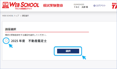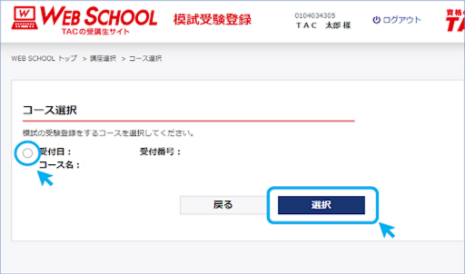 サイトへ遷移したら、模試の登録を行う「講座」「コース」にチェックを入れ、”選択”をクリックしてください。