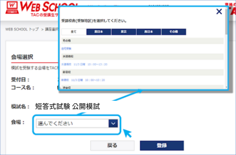 受験を希望する会場を選択し、”登録”をクリックしてください。