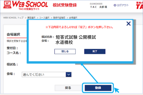 △受験会場を選択したら、“登録”→“完了”とクリック。