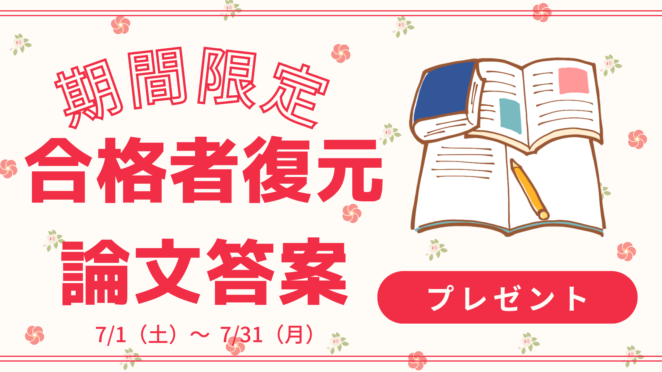 合格者が残した「 論文作文復元答案集 」(全45題)プレゼント!≪期間限定≫7/1(土)~7/31(月)お申込み完了分