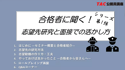 TAC の合格者が体験談を語ってくれます。面接準備の仕方や学習方法など、受験生にとって大変貴重な話ばかりです。また、少人数で実施するからこそ、じっくりと質問もできます! 先輩の体験を聞くことで、今後の対策法が明確になり、モチベーションアップにも繋がります。