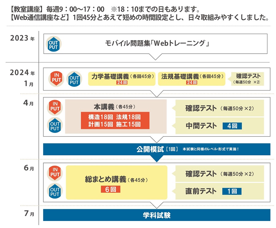 苦手意識を持ちやすい構造(力学)と演習に時間のかかる法規を二回転できるカリキュラム