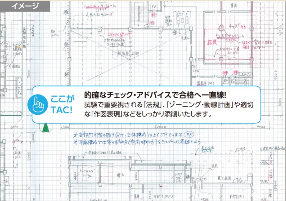 製図対策は、添削指導を受けることで、学習効果が高まります。講師からのコメントは、新たな気づきが得られ、今後の学習の指針を示してくれます。充実の添削指導であなたを合格まで導きます。