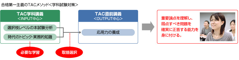 つまり、単なる過去問対策中心の学習では足りず、時代のトピックを意識したうえで、重要な論点をしっかり理解する、という質の高い学習が求められています。そのため、学習範囲は拡大し、受験者の負担は増すばかりです。 そこで、TACでは、合格に不可欠な知識を厳選し、学習項目を効率的に絞り込むTACメソッドを開発しました。全範囲を広く浅く網羅するのではなく、重要論点を取捨選択し、絞り込んだ効率的で質の高い学習を提供します。