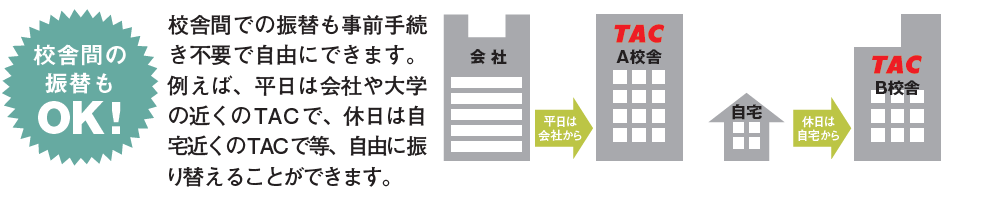 校舎間を自由に振り替えて受講できます。平日は会社・大学の近くの校舎で、休日は自宅近くの校舎で受講するなど、フレキシブルに受講できます。
