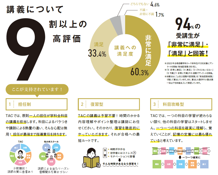 TACの主要校舎では講師は「担任制」。一人の担当講師が学科全科目の講義を担当します。これは講師の質に自信があるからこそ実現したシステムです。そもそも合格のためには、担当講師が全科目のカリキュラムを体系的に構築して講義を行うことが重要です。それにより、受講生一人ひとりの個性や進度を把握することができ、的確なアドバイスが可能となります。科目によって講師の教え方が違う、講師との人間関係が構築できない、もう、こんな心配は無用です。