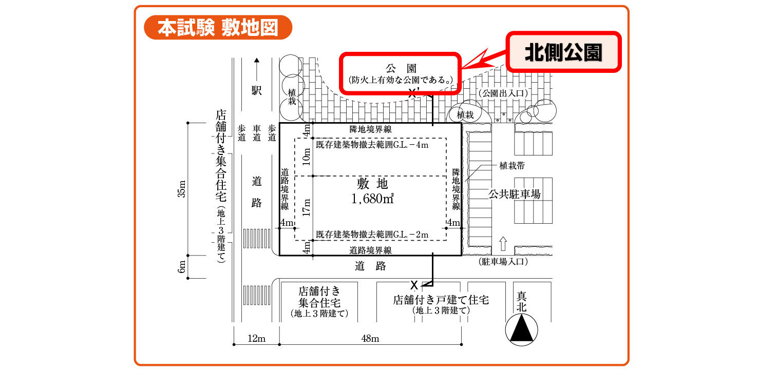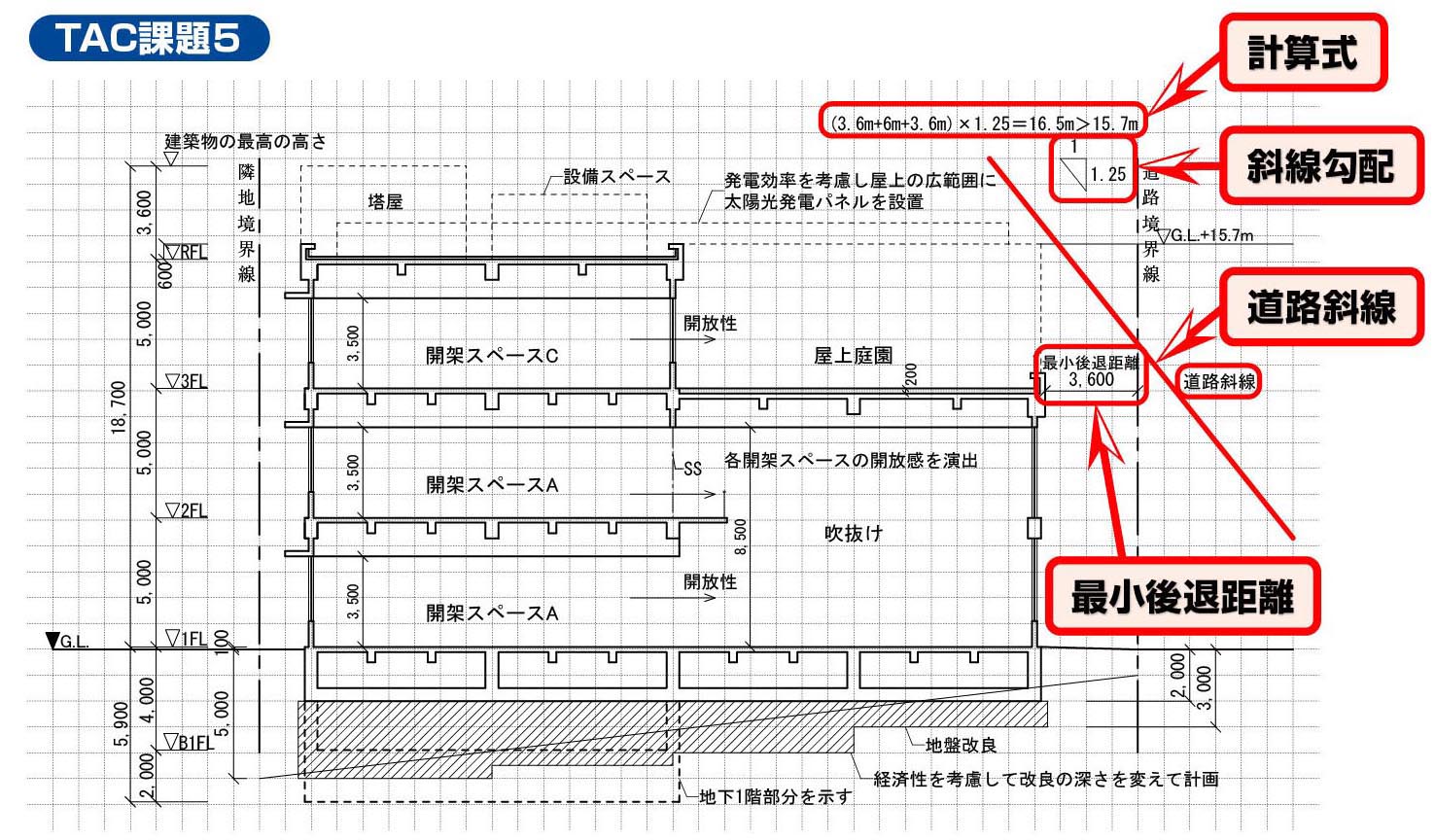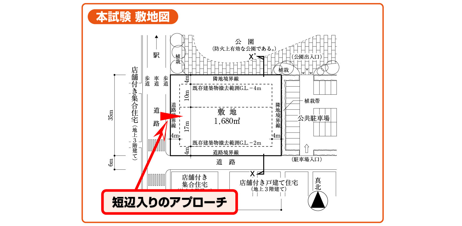 本試験では、西側隣地(公共駐車場・駐輪場)側に発生する隣地斜線についての要求がありました。