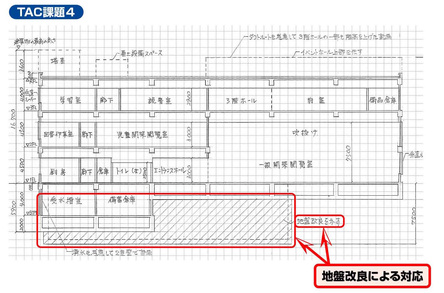 TACでは、多くの課題において基礎免震構造の学習をしていましたので、大多数のTAC受講生は免震構造を採用することで、対応できていました!