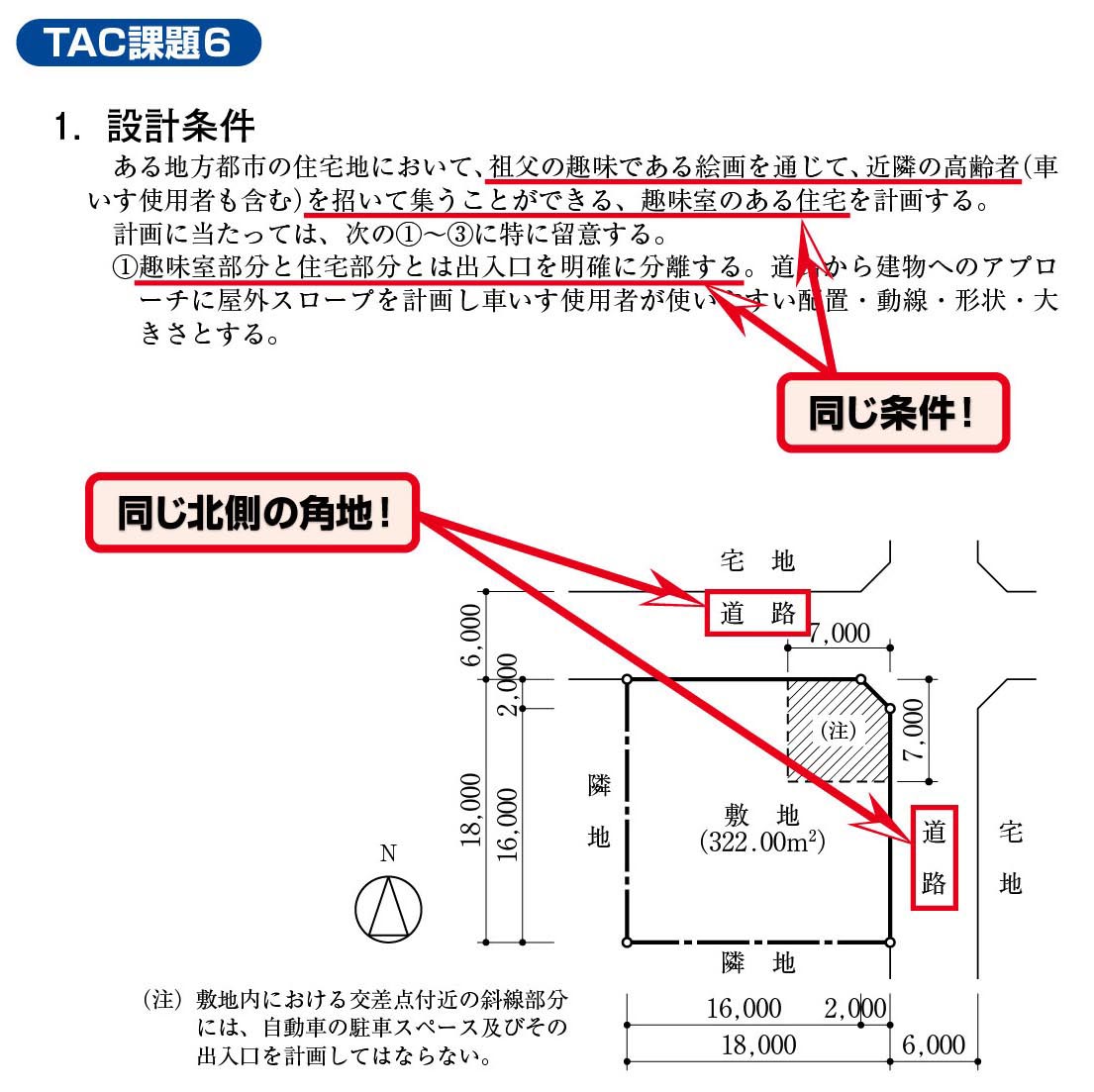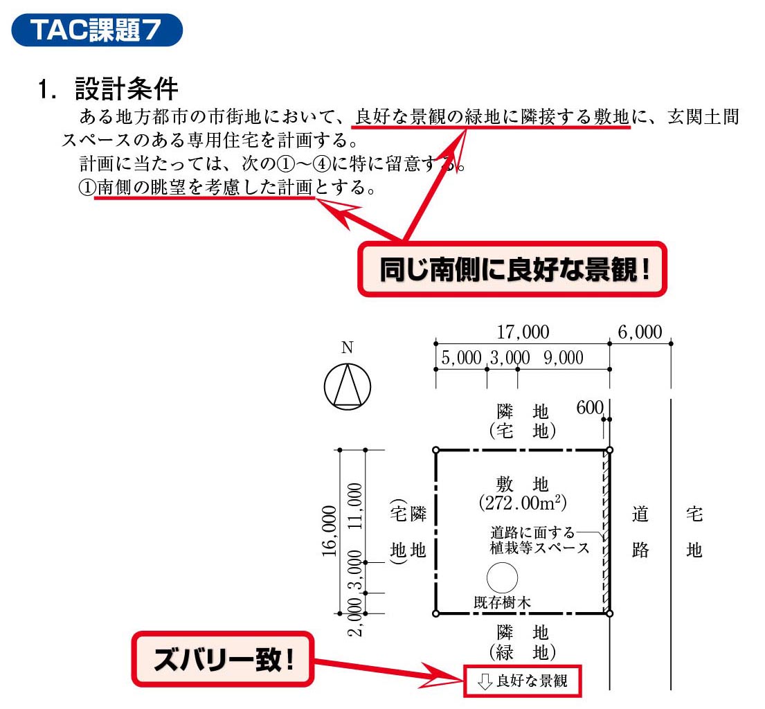 TACでは「課題5」「課題6」の合計2課題において類似条件の角地を出題しており、2面接道を活かした複数のアプローチ計画を学習していました。