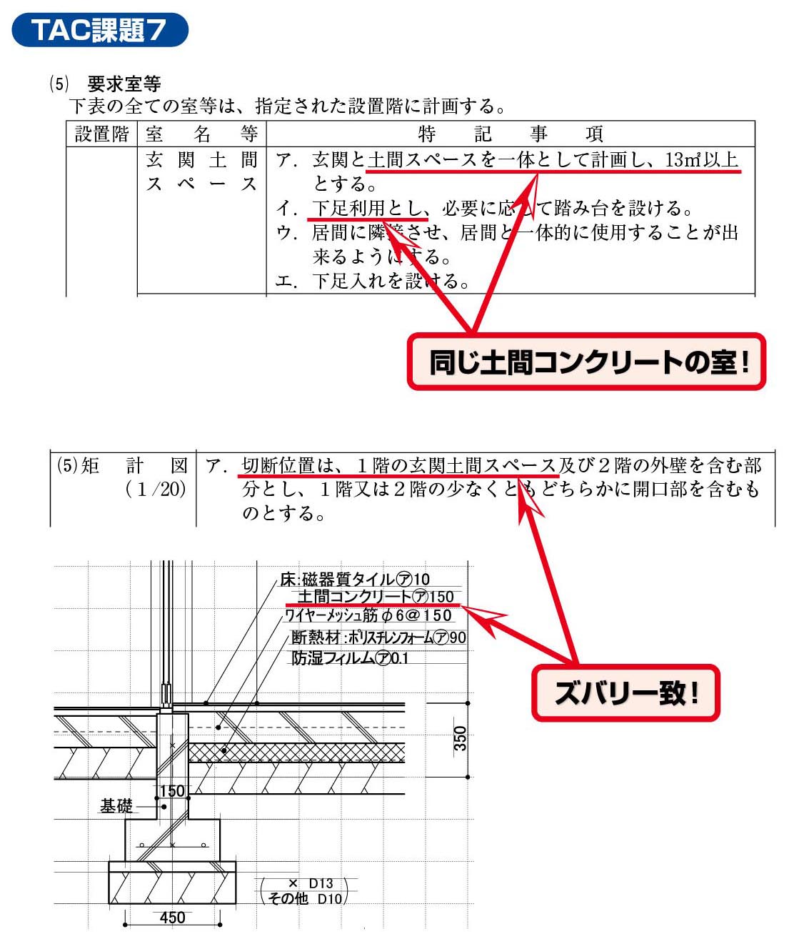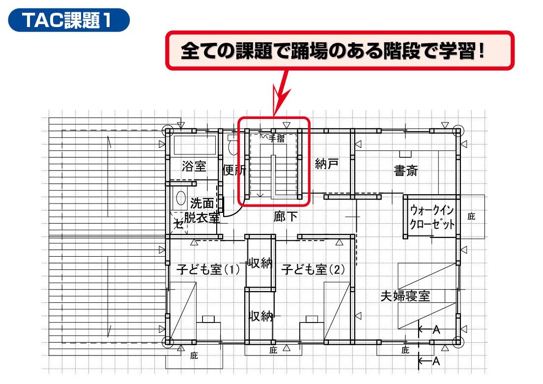 矩計図については毎年多くの受験生が不安に感じている中、標準的な切断位置・条件での出題となりました。TACでは、同じ条件の矩計図を「課題1」で学習していました。加えて、バルコニー付き、土間床仕上げ、屋外テラス付き等の様々な切断位置・パターンについても学習していました。