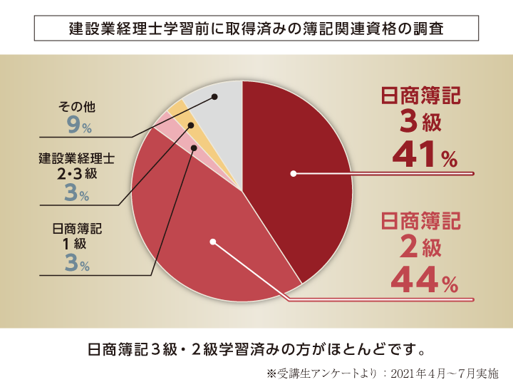 日商簿記検定試験3級または2級の受験経験がある方や、学習経験のある方であれば、その知識のベースを存分に活かして建設業経理士の学習を進めていくことができます。