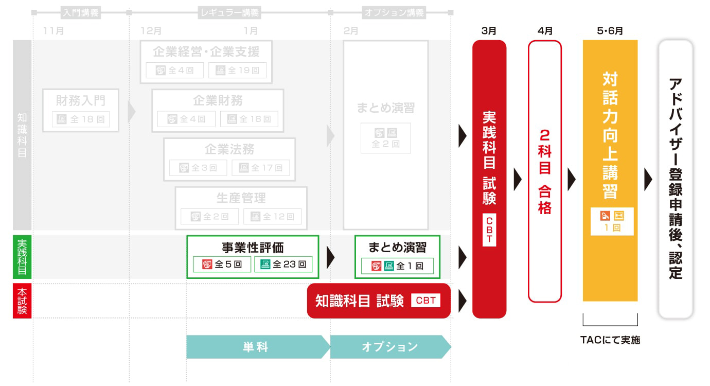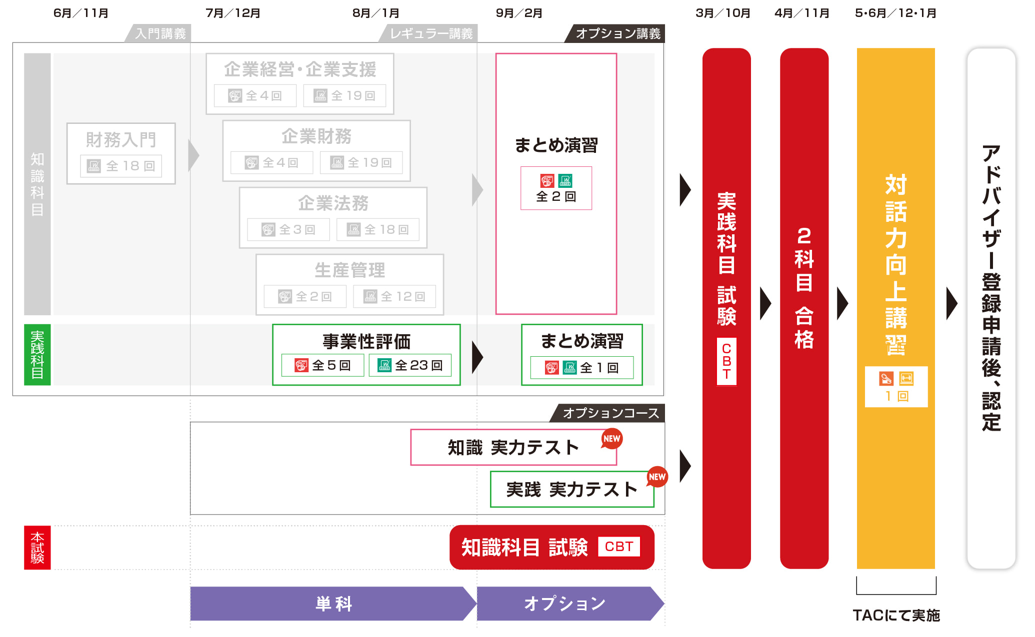 これにより、これらの資格に登録されている方が「企業経営アドバイザー」資格の認定を目指す場合は、事業性評価について問われる「実践科目」のみを学習して受験すればよいこととなります。実践科目の合格者は、経営者との対話スキルを身につける「対話力向上講習」を修了することで、「企業経営アドバイザー」として認定されます。