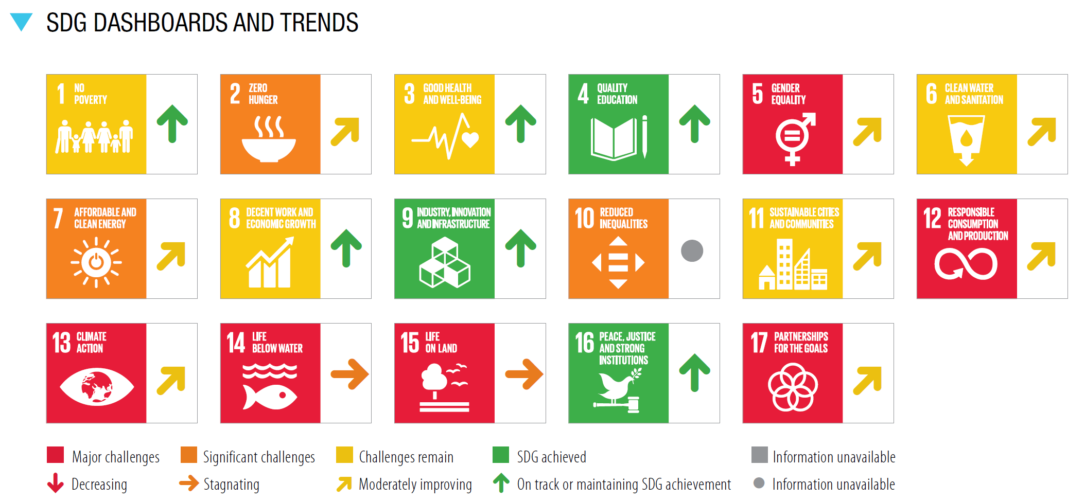 上の図は、同レポートに掲載されている日本のSDGs達成度です。 目標タイルの色は達成度を表しており、日本は「目標4:質の高い教育をみんなに」、「目標9:産業と技術革新の基盤をつくろう」、「目標 16:平和と公正をすべての人に」の3つの目標のみ達成(緑色)という評価になっています。*2
