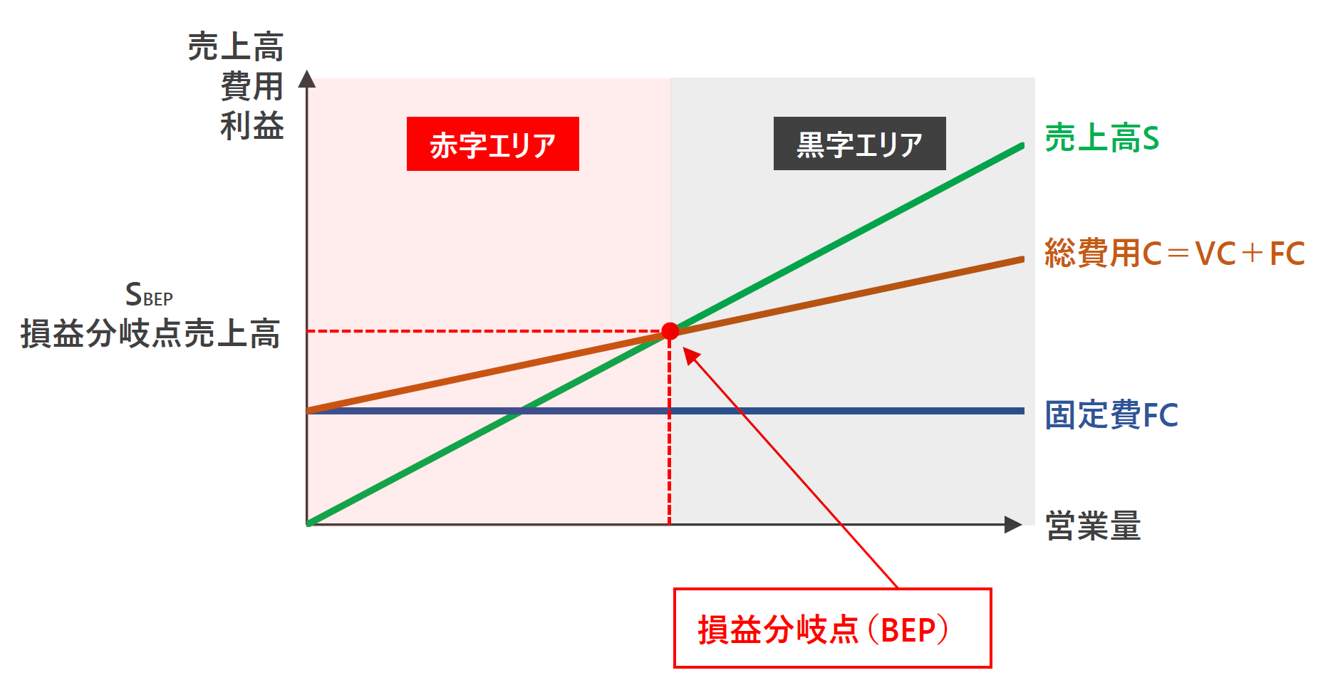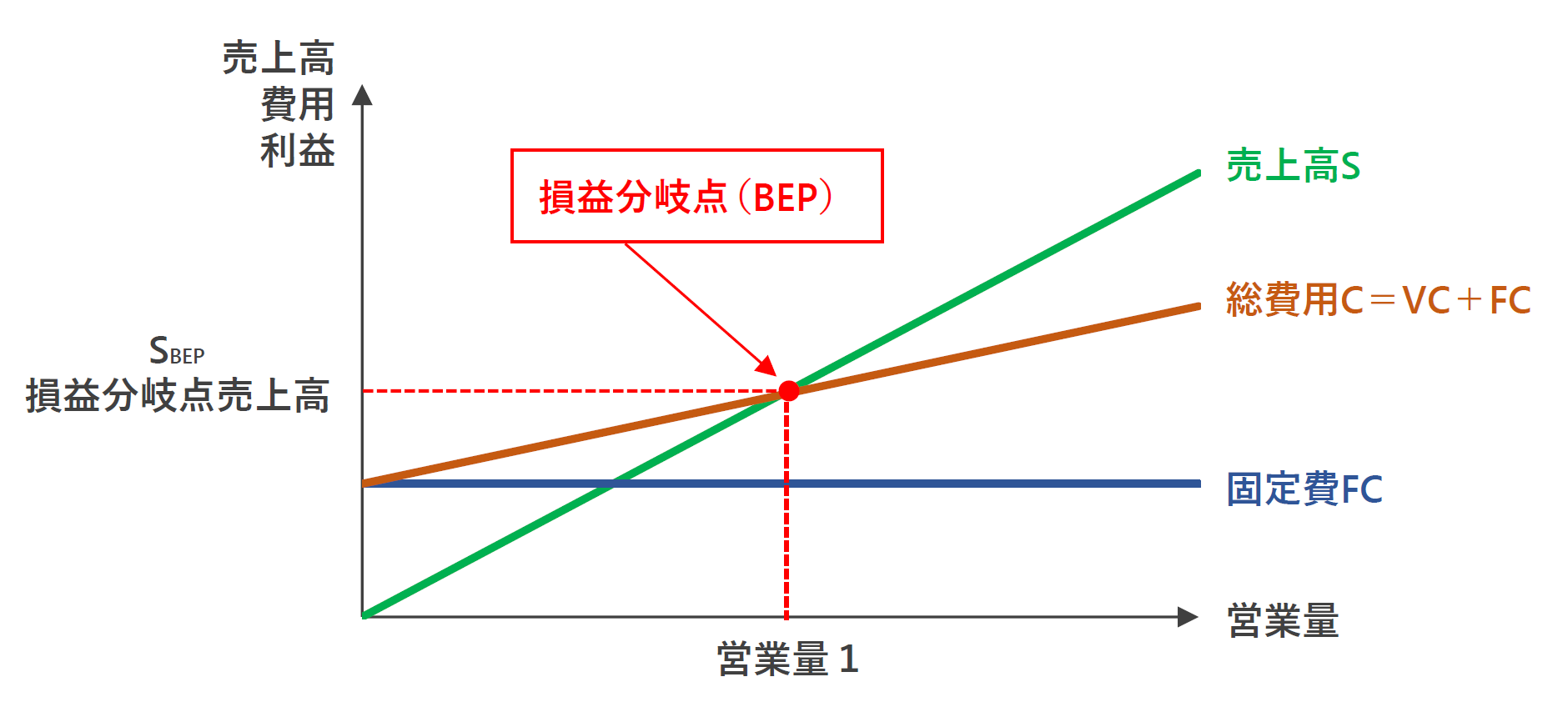 総費用(C)は、変動費(VC)+固定費(FC)の合計ですが、この売上高(S)と総費用(C)が交わった点を損益分岐点といいます。損益分岐点は、英語でBreak-Even-PointでありBEPとも表現されます。まさに収支「トントン」の地点です。図1の横軸の「営業量1」はBEPの販売量であり、縦軸の「損益分岐点売上高(SBEP)」はBEPの売上高を表します。