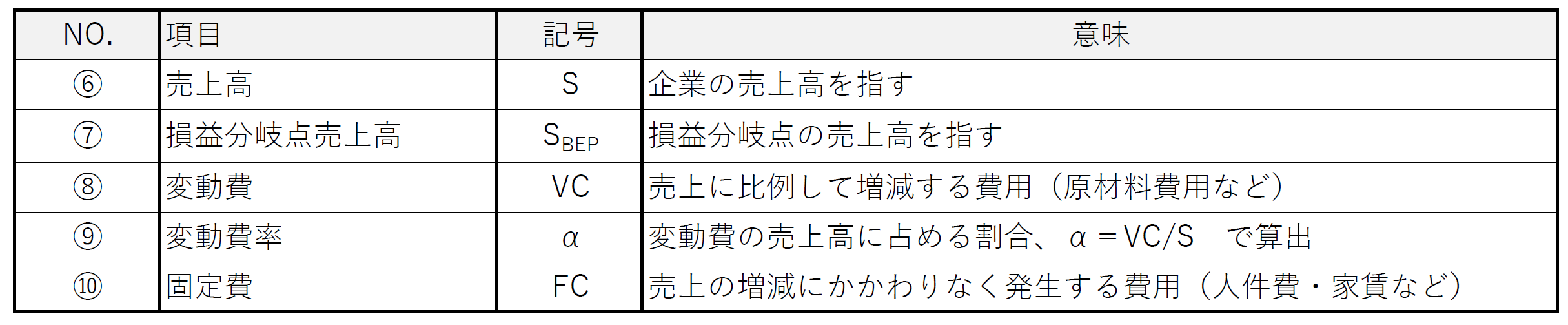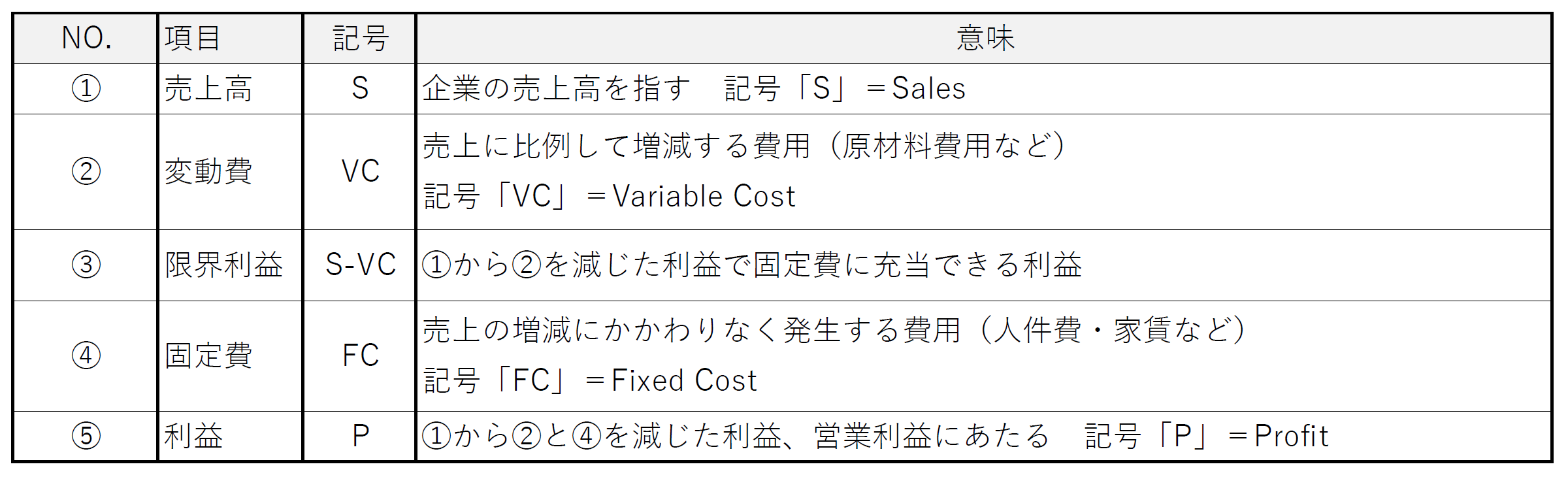 また、財務や会計などの書物には、CVP分析(Cost-Volume-Profit Analysis)の中で紹介されている分析方法です。このCVP分析とは、原価(Cost)と営業量(Volume)と利益(Profit)の関係性を分析する方法で、中でも損益分岐点により注目して分析する場合には損益分岐点分析という表現が使われます。損益分岐点分析の説明には、グラフと記号を使いますので、項目を下記にまとめてお伝えします。