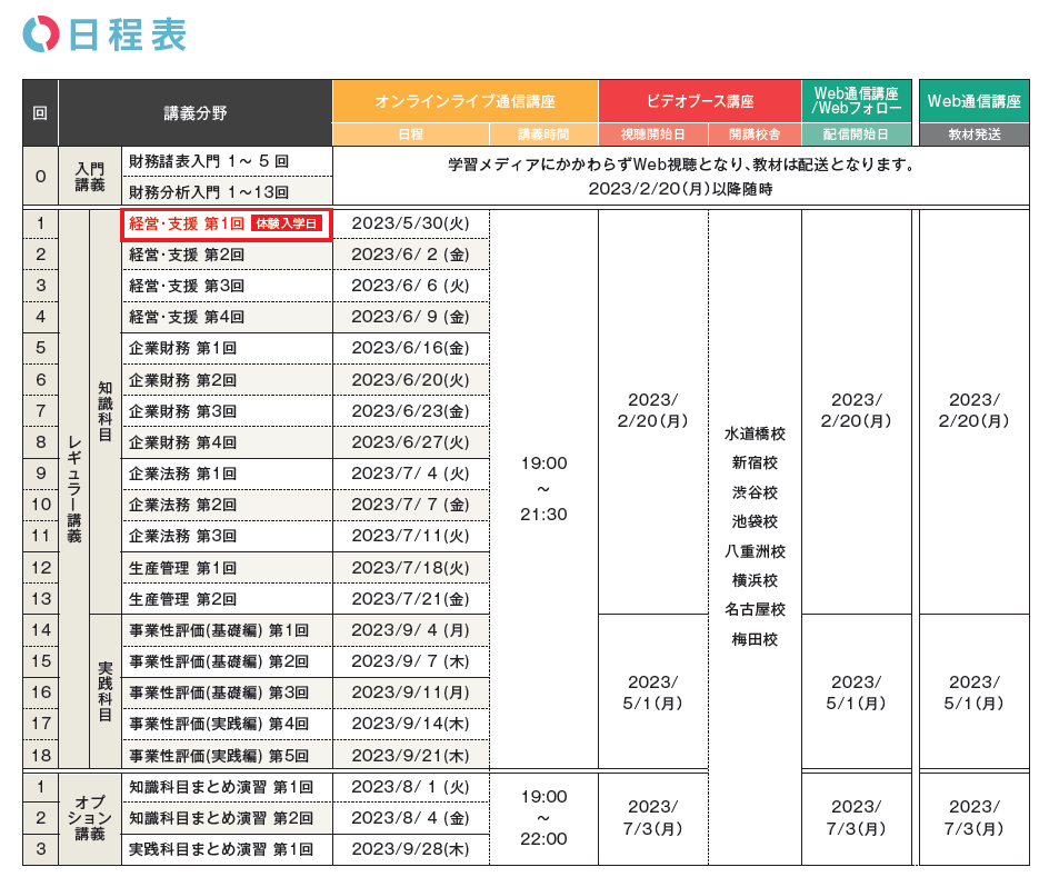 講義視聴・配信開始日および教材発送の詳細は、日程表にてご確認ください。