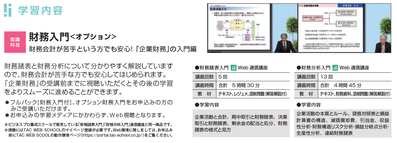 経営知識を効率よく学べる基本講義と、試験で出題されそうな重要論点を集中して学べる演習講義(まとめ演習・実力テスト)をセットにしたコースです。[財務入門付]なら財務諸表について学んだことのない方や苦手な方でも安心して学習を始められます。