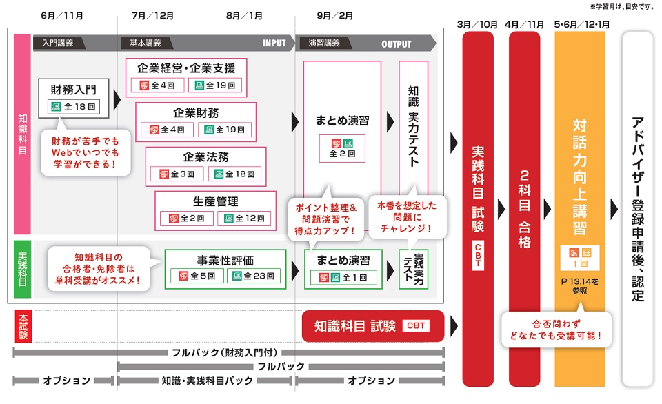基本講義の「企業経営・企業支援」「企業財務」「企業法務」「生産管理」「事業性評価」の全ての科目に演習講義の「まとめ演習」「実力テスト」がついたフルパック。