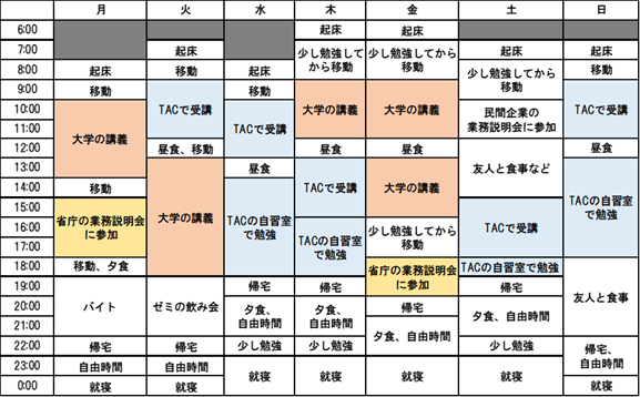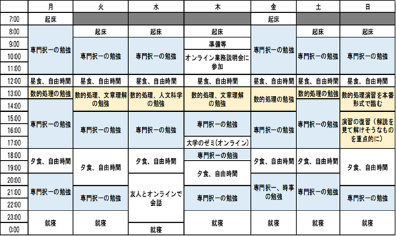 内定者が受験生だったときどんな1週間を送っていたか一例を、通常期(10~1月)と直前期(3~4月)に分けてお伝えします。学習スケジュールを立てる際の参考にしてみてください。