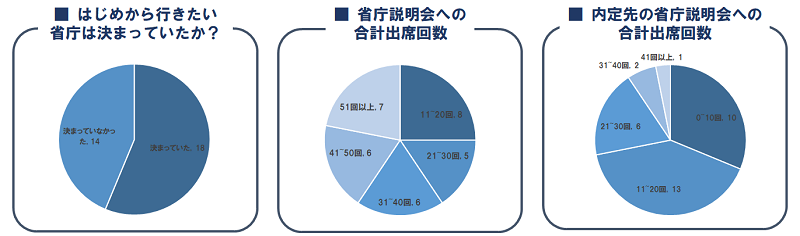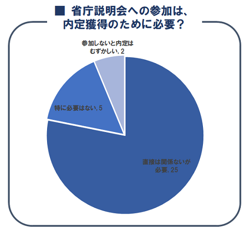 - 説明会に参加しなくても高い実力や運があれば内定獲得できるが、私が回った省庁は全て説明会やインターン等である程度評価が固まっていると感じたから。