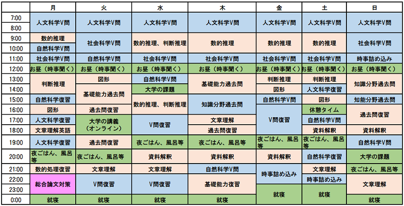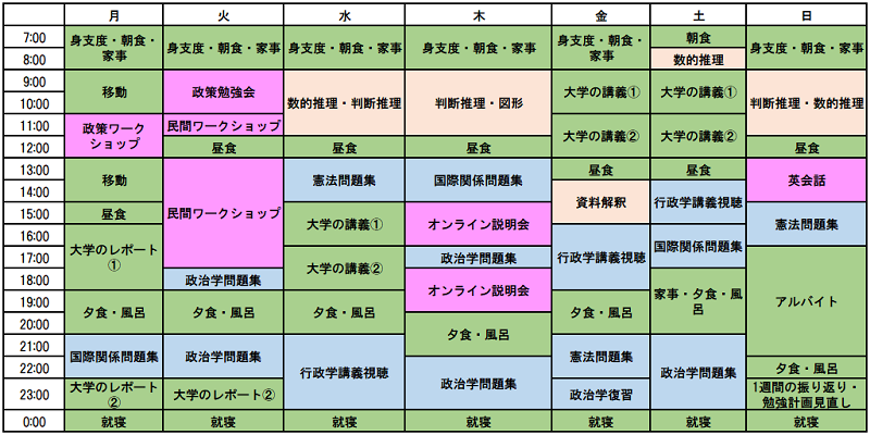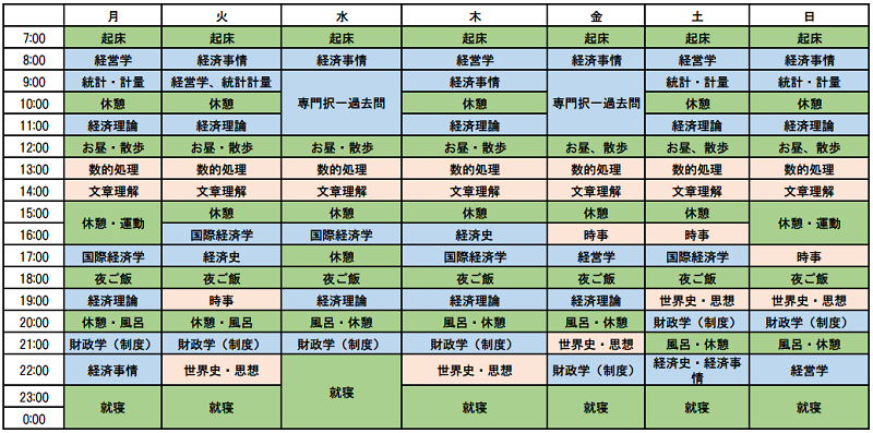 内定者が受験生だったときどんな1週間を送っていたか一例を、通常期(10~1月)と直前期(3~4月)に分けてお伝えします。学習スケジュールを立てる際の参考にしてみてください。