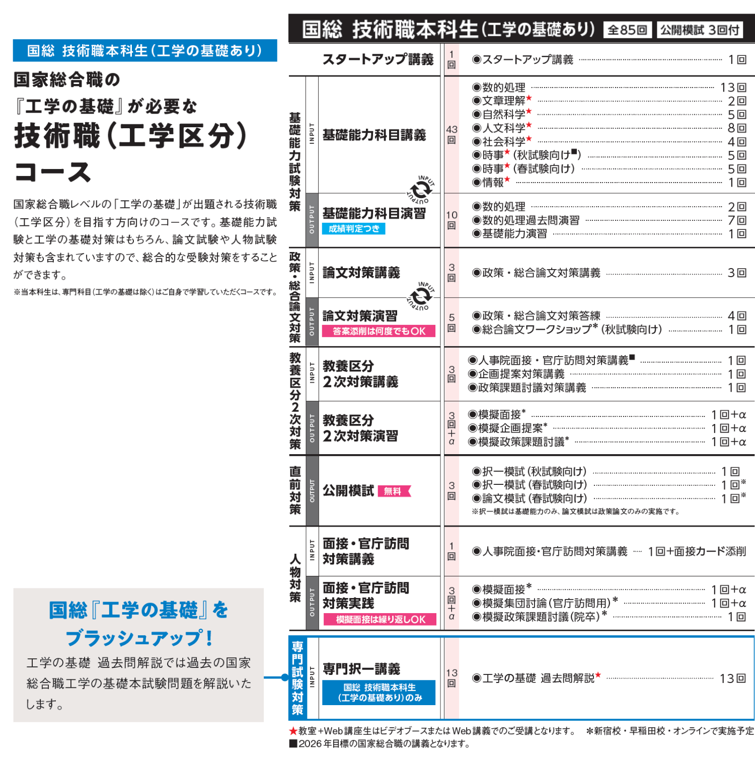 国家総合職レベルの『工学の基礎』が出題される技術職「工学区分」と「教養区分」の両方を目指せるコースです。基礎能力試験と工学の基礎対策はもちろん、論文試験・人物試験対策や教養区分対策も含まれているので、総合的な受験対策をすることができます。