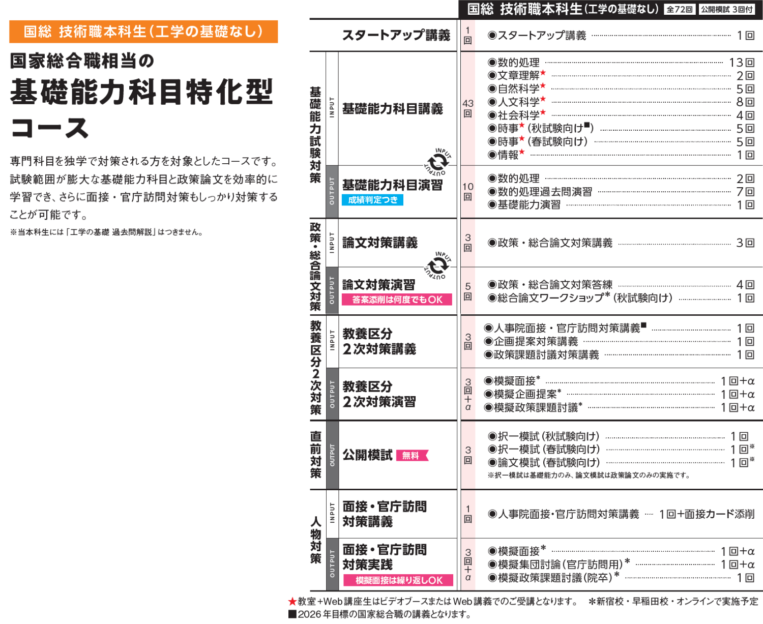 国家総合職 技術職「理系各区分(工学区分除く)」と「教養区分」の両方を目指せるコースです。専門科目を独学で対策される方を対象としており、試験範囲が膨大な基礎能力科目や独学での対策が難しい政策論文を出題頻度の高いポイントに絞って学習できます。さらに面接・官庁訪問対策もしっかり対策することで秋試験・春試験の両方に向けた効果的な対策が可能です。