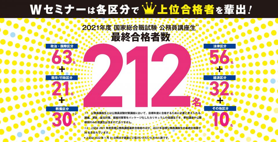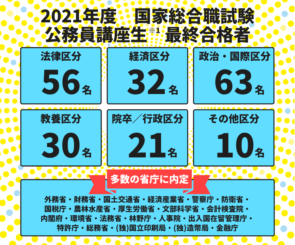 1 公務員講座生とは公務員試験対策講座において、目標年度に合格するために必要と考えられる、講義、演習、論文対策、面接対策等をパッケージ化したカリキュラムの受講生です。単科講座や公開模試のみの受講生は含まれておりません。
