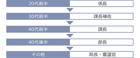 官僚には、将来各省庁のリーダーとなることが求められています。幅広い見識を身に付けるため、早くから幹部養成コースを歩み、人事異動を繰り返しながら、多彩な職務を経験します。昇任のスピードも速く、若くして政策の企画や立案といった責任のある仕事を任されます。