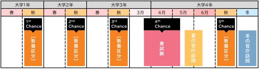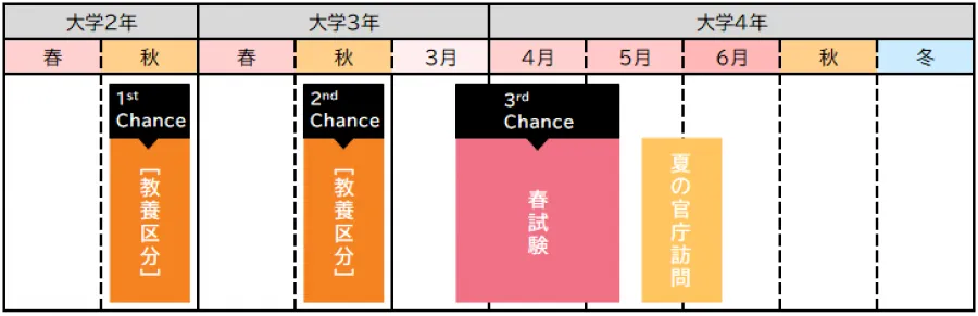 変更点②で述べた点を踏まえると大学在学中に受験できるチャンスは、現役で大学の入学されている方なら最大6回、浪人して大学に入学されている方なら最大8回になります。いずれか1回に合格すれば、国家総合職試験最終合格者となり、大学4年時の官庁訪問(志望府省庁で内定を得るための面接)に臨むことができます。