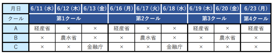2023年の官庁訪問は従来の5クール制から4クール制に変更され、内定までの官庁への訪問回数が4回になりました。1つの官庁に訪問すると朝8:30に集合して夜まで時間がかかりますので、1日に訪問できる官庁は1つです。このため必然的に、各クールで回ることのできる官庁の数は決まってきます。第1クール、第2クールは3つまで、第3クールは2つまで、第4クールは1つといった形です。